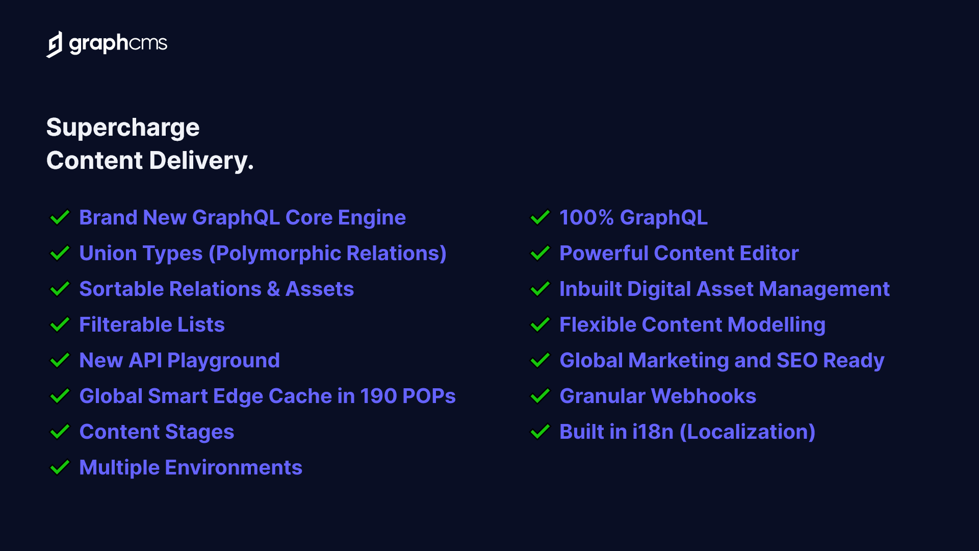 As the first GraphQL native Headless CMS, our mission is to remove traditional content management pain points by using the power of GraphQL, and take the idea of a Headless CMS to the next level.